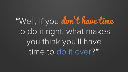 The reality is that taking the time to do things right the first time will virtually always, in the long run, take significantly less time and result in a higher quality in project delivery than it does to do things over. By not doing things right the first time, you will not only trouble yourself (and look bad in the eyes of almost everyone), but you will greatly impact the lives of many others as well.